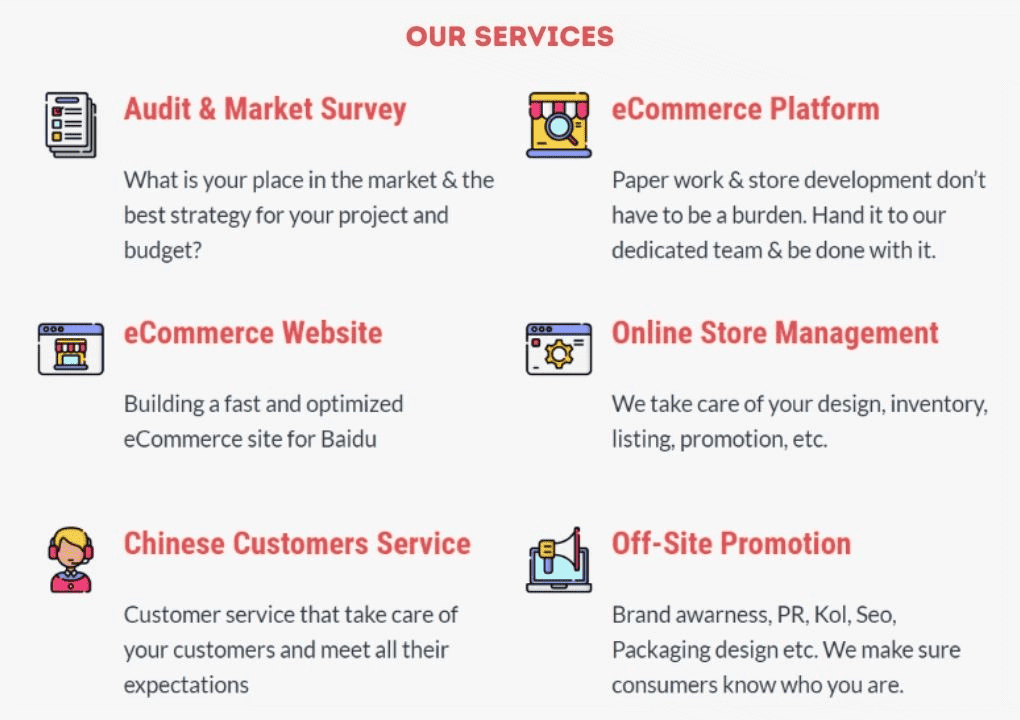 We are a China-based marketing agency offering cost-effective solutions to foreign brands interested in tapping into the Chinese eCommerce market. Our team of Chinese and foreign experts has the experience and know-how needed to succeed in this lucrative, yet complicated market.