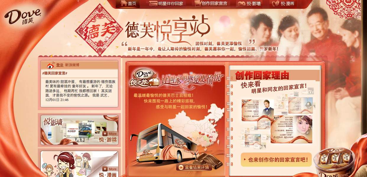 On weibo account Dove consumers were supposed to share posts on Dove and their desire to return home on the bus Dove. Some were selected to participate in a road trip by bus designed for the chocolate brand to go home (usually students wishing to return to their parents home for holidays and for free). Travel from one region to another in China can often be very expensive and inconvenient. So this operation was a buzz on weibo with a tremendous success.