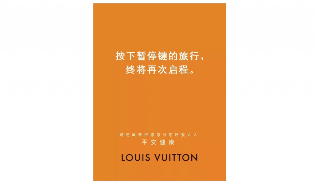 The brand that stood out from the crowd is Louis Vuitton, by posting a sincere and heartfelt message on their WeChat account: “Every paused journey will eventually restart. Louis Vuitton hopes you and your beloved ones stay safe and healthy.”