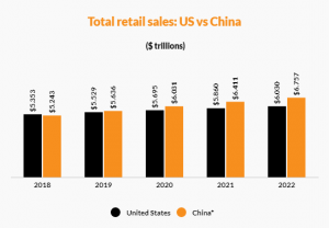 - Chinese retail sales are expected to reach $6.76 trillion by 2022, compared to $6.03 trillion for the USA.