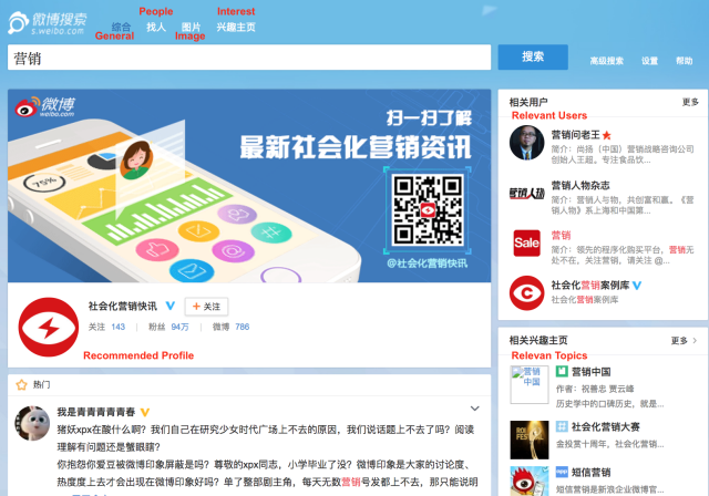 - By searching on Weibo, marketers can get relevant results for people, posts, interests, and images. Under the category of interests, one can also see subcategories covering books, topics (identified by hashtags), places, applications, and music.