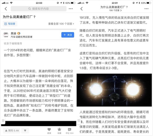 - German automobile manufacturer Audi is a good example of how to use the site. In China, Audi was called “The Headlight Company (灯厂)” by Chinese consumers because it’s most famous for its headlights. So, soon after creating their organization account on Zhihu, Audi answered the question Why is Audi called “The Headlight Company”? (为什么说奥迪是灯厂?) The answer got more than 5,400 likes (“upvotes” in Quora) and nearly 600 comments.