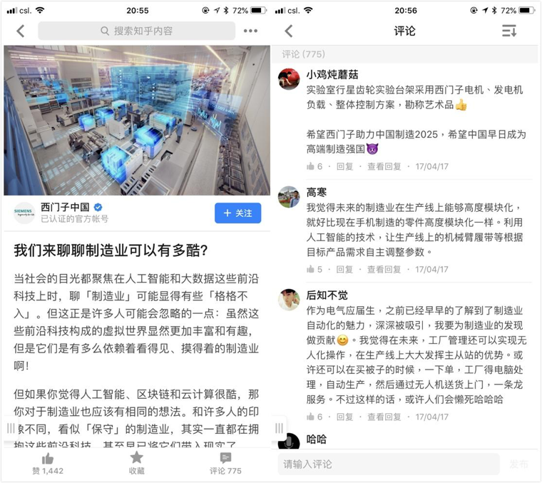 Siemens talked about how cool the manufacturing industry can be in its Zhihu Column, and the article got more than 1,400 likes and 775 comments.